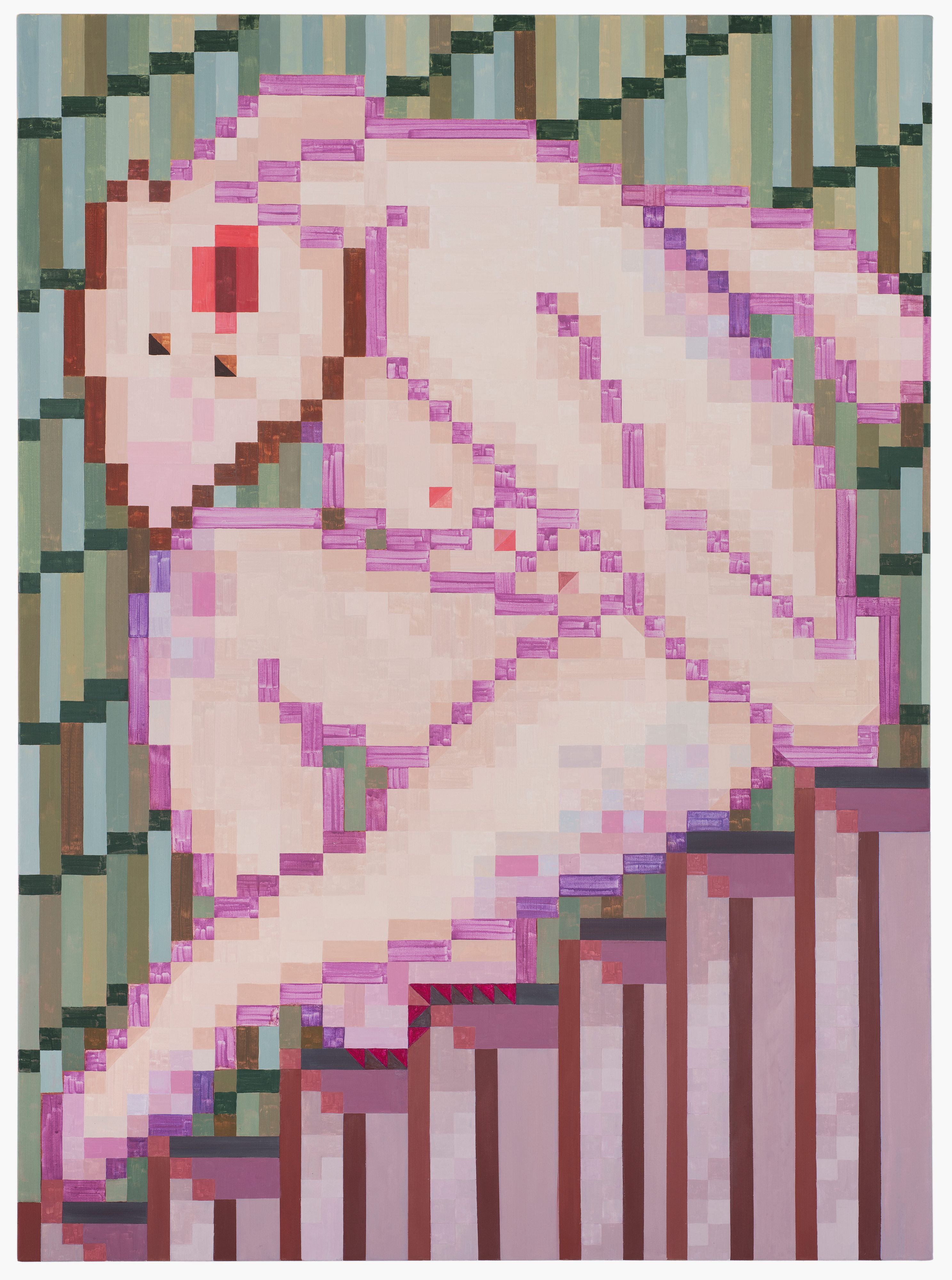 In her paintings, Maria Schumacher deals with the creation of narrative-psychological spaces within which she explores the complexity of relationship structures. States such as loneliness, fear, grief, love and sexuality and their universal nature preoccupy her just as much as the use of patterns, ornamental arrangements and the ritualistic charging of signs and symbols. The forms and figures depicted by Schumacher can have different effects depending on how they are viewed and are particu- larly multi-layered.
