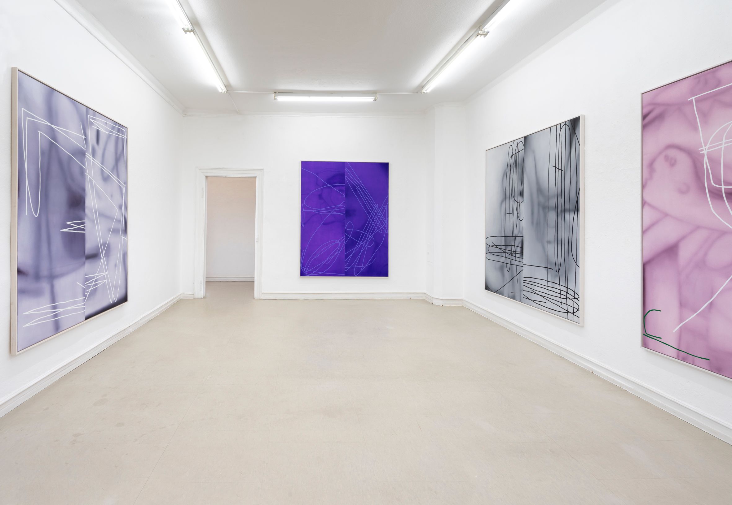 The pictorial motifs are no longer completely detached from any reference to concrete figuration, but question and revolve around it. The line always moves between figuration and abstraction and is in the process of defining surface and space more precisely.