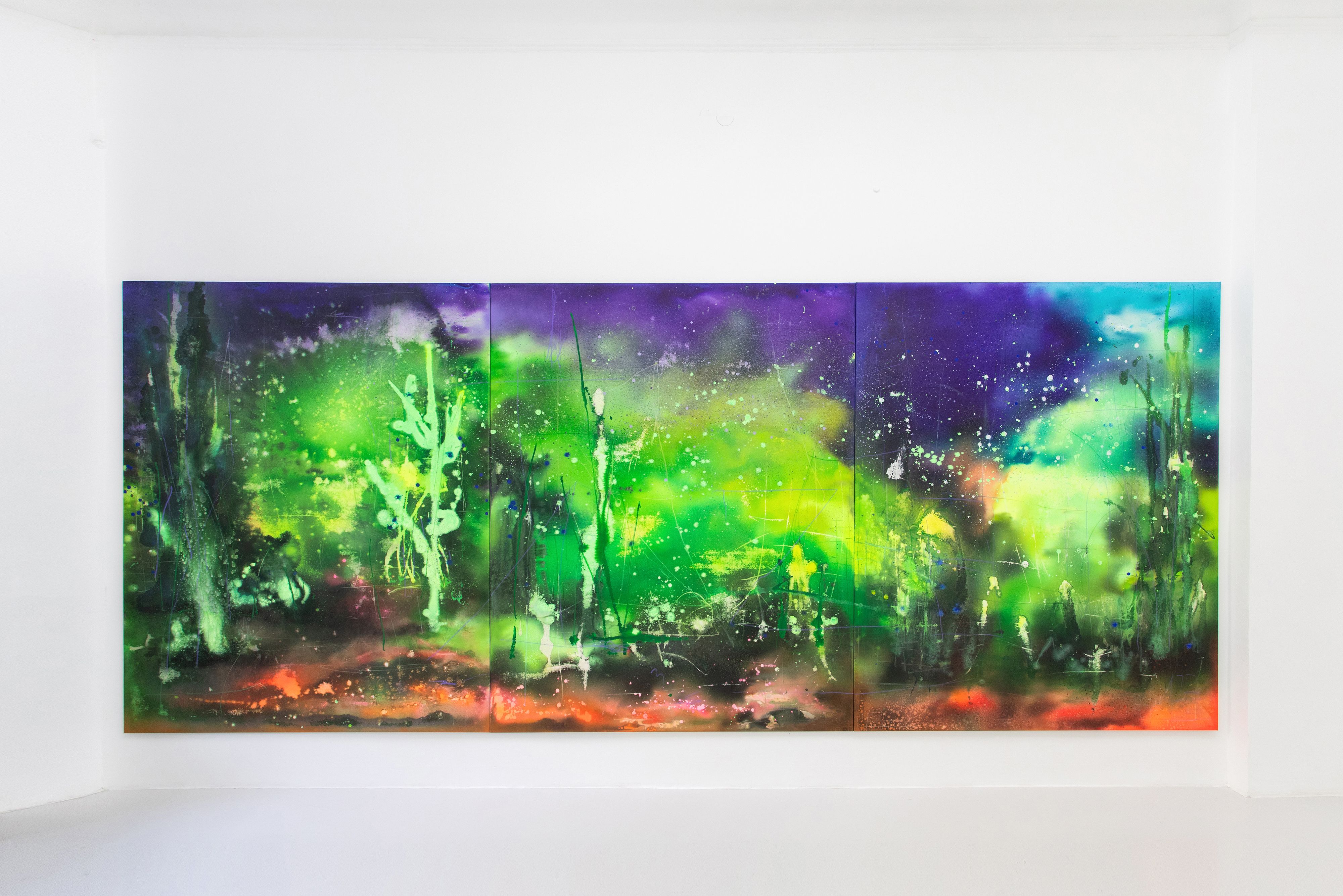 Intense purple to red tones in the upper, and rich green tones in the middle and lower fields of the picture, give rise to new ecosystems between sky and earth, darkness and light, spring and winter, day and night. Interrupted by spontaneously placed gestures that resemble lightning or stardust, August's colour storms and thunderstorms immerse us in a landscape in flux and make us aware of the beauty of a world without us humans.