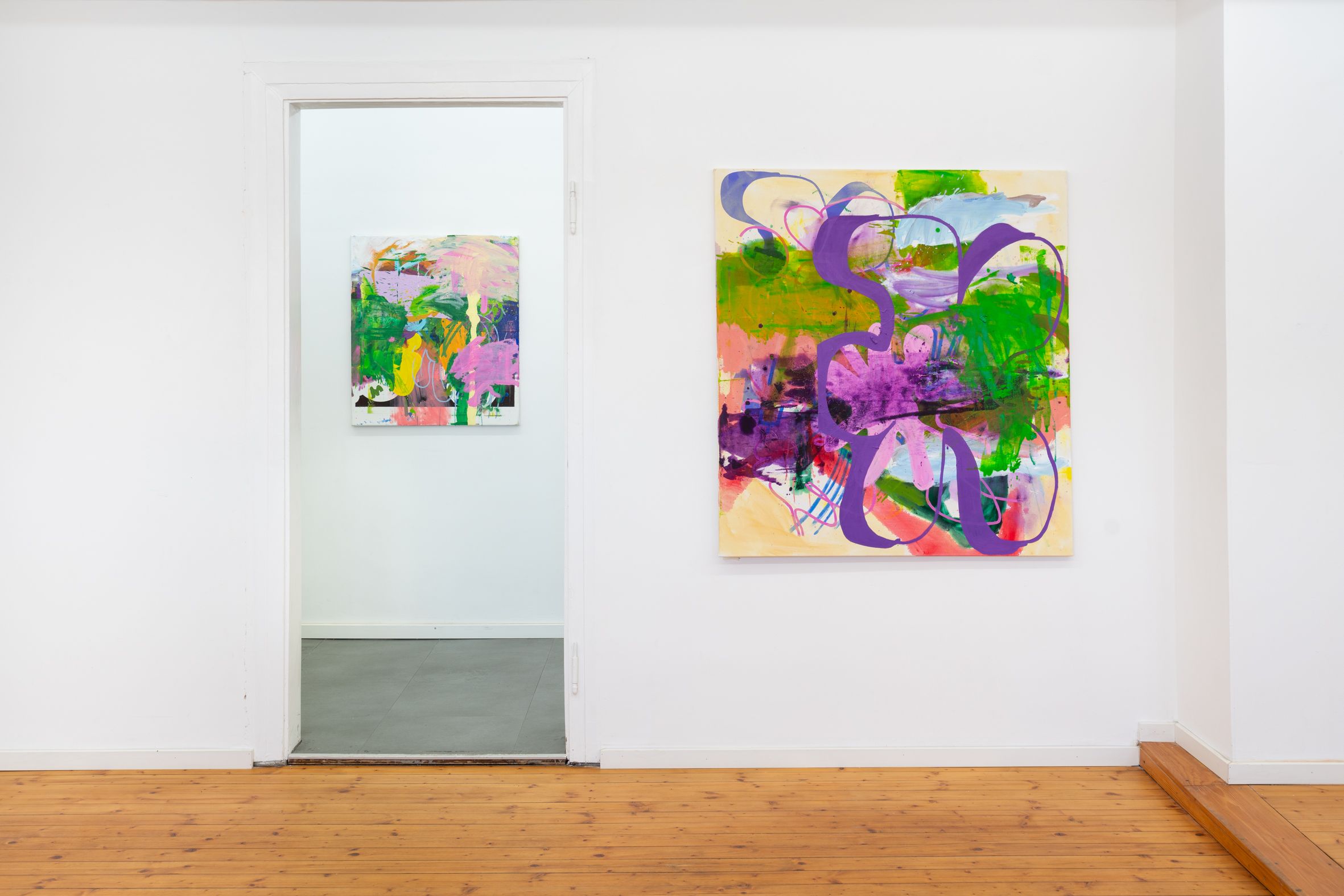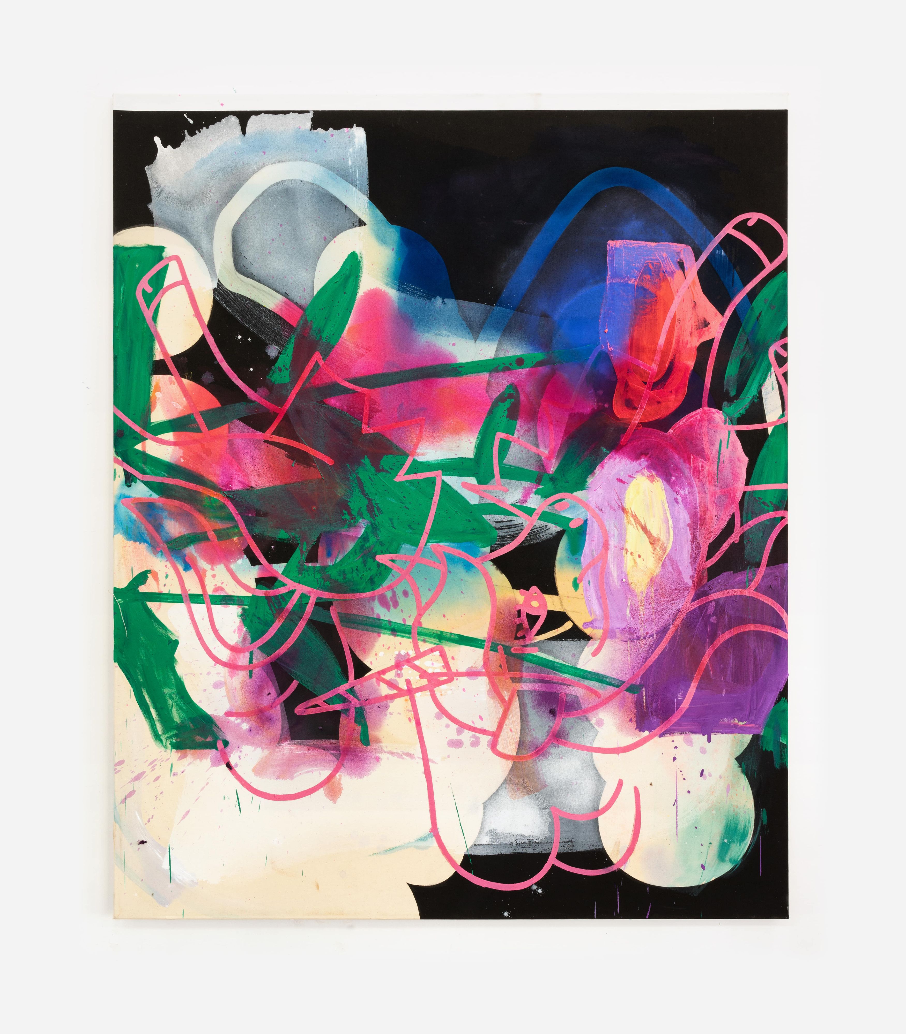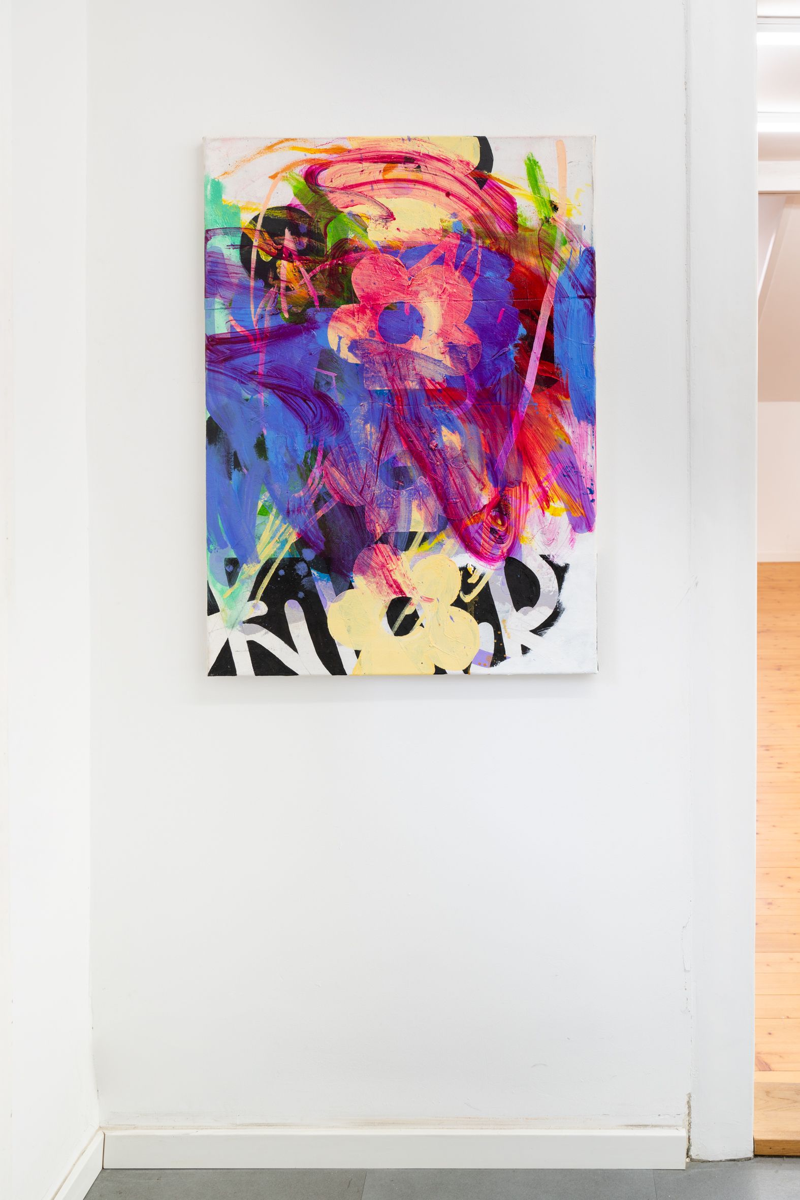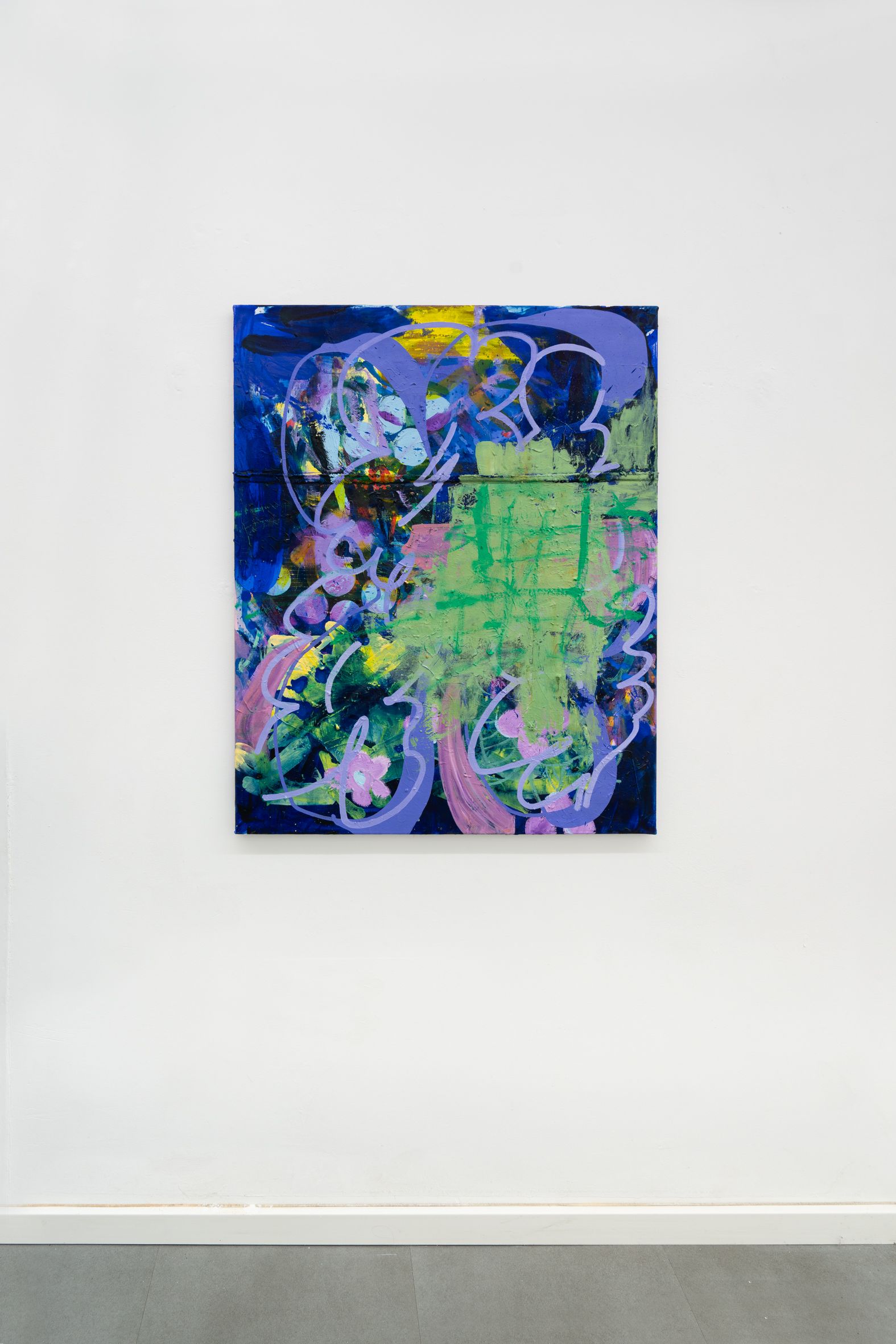 These elements are fragmented, scaled, and reassembled on canvas, where meaning emerges through their relationships rather than as singular motifs. Scribbly, early-digital brushstrokes recall the aesthetics of early graphic programs and are translated into dense, material painterly forms. Bär’s works reflect a present in which digital and analog processes are inseparably intertwined.